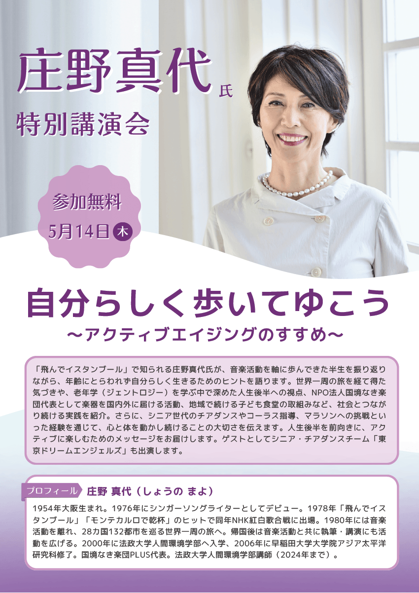 【申込受付中】「飛んでイスタンブール」で知られる庄野真代氏が、音楽活動を軸に歩んできた半生を振り返りながら、年齢にとらわれず自分らしく生きるためのヒントを語ります。